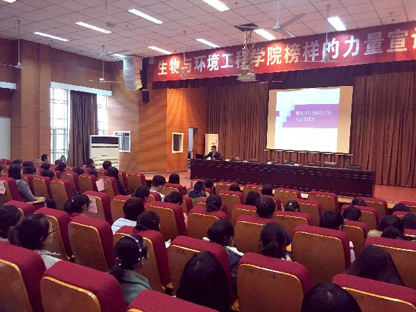 在全党全国人民深入学习贯彻党的十八大和十八届三中、四中、五中全会精神的新形势下,为深入贯彻落实党中央和习近平总书记系列讲话精神,引导广大青年学生为实现中华民族伟大复兴而努力奋斗,按照校团委“践行社会主义核心价值观,争做向上向善好团青”主题团日活动要求,3月9日下午,生物与环境工程学分院团委在校明德楼A区报告厅举办了“与信仰对话—榜样的力量”主题团日宣讲会。校团委副书记武文斌、学生工作处教育管理科科长李承出席了此次主题团日活动,生物与环境工程学院近200名团员青年参加了此次活动。活动由2013级环境生态工程专业白明皓同学主持。