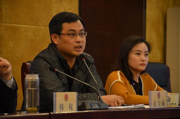 校党委委员、副校长韩权发表讲话。他指出:目前全国正在掀起的“大众创业,万众创新”创新创业浪潮,为高校教育发展和改革带来了战略机遇。向在场师生提出了三点希望和要求:一是高度重视、广泛宣传、精心组织以专业的水平包装项目,充分调动学生的参与积极性,积极争取专家学者的支持和指导,充分整合资源,形成合力。二是要打造一支高水平的教师指导团队主动向参赛学生提供必要的物质和技术支持,加大对大赛中优秀项目的帮扶力度,为优秀项目的落地孵化创造条件,提升大赛水平和影响力。三是积极进取,勇于挑战。大学生创业大赛作为创新创业教育改革的实践环节,着眼于培养学生适应未来社会的生存能力和创新能力。同学们要以“挑战杯”竞赛为契机,充分利用学校提供的有利条件,积极参加科技创新,培育创新意识,努力成为高素质创新型人才。