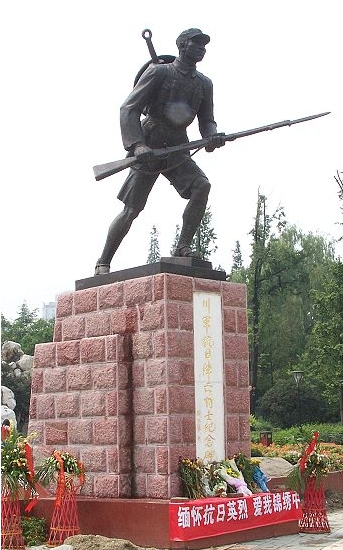 77日,全民族抗战爆发77周年。我校实践队员来到川军抗日阵亡将士纪念碑。该纪念碑是为了纪念在抗日战争中阵亡的60多万川军而于1944年修建的。纪念碑上一位川军士兵,穿着短裤、绑着绑腿,背着斗笠大刀、手握步枪,胸前悬挂两颗手榴弹,注视前方,就像即将冲锋的战士。实践队员们在纪念碑前用鲜花祭奠遇难同胞,感恩阵亡先烈。偶遇成都吉小宝文化艺术中心创建人吉小宝先生的个人纪念抗日英雄画展,他与实践队员亲切交谈,与我们合影留念。此次活动引起成都市广播电台的关注,记者采访了校学生会主席文章同学。