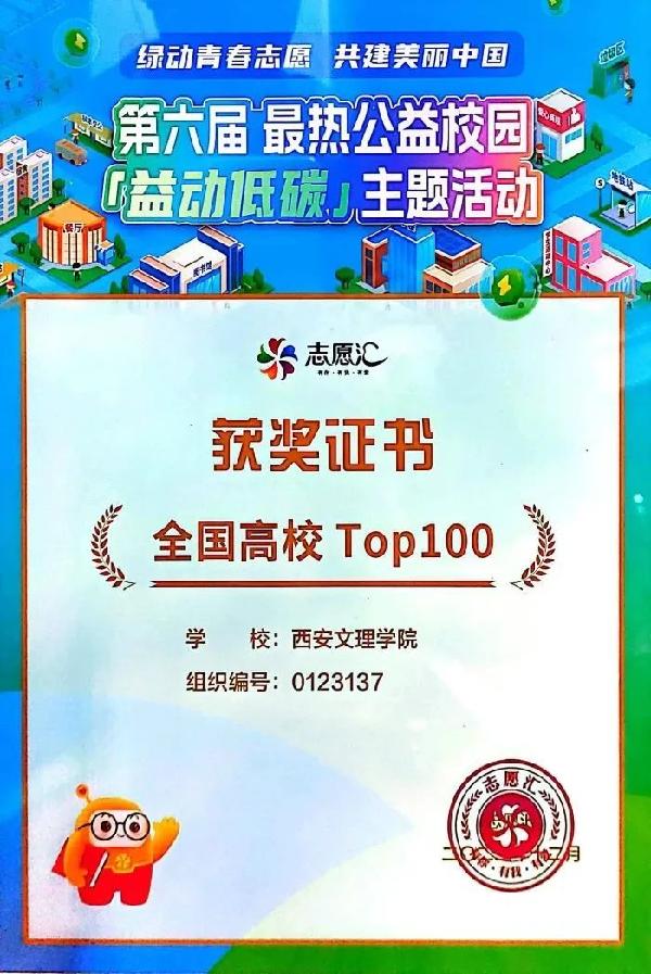 此活动全国共有455所高校参与开启低碳校园虚拟场景,覆盖22个省(自治区、直辖市),在校团委的广泛动员及我校全体青年志愿者的共同努力下,我校荣获“益动低碳”主题活动“全国高校Top100”荣誉称号。